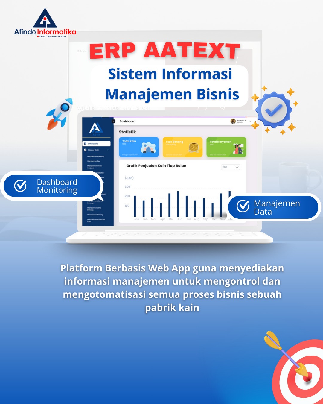 ERP-AATEXT adalah platform berbasis web app yang dirancang khusus untuk mendukung industri tekstil, terutama pabrik kain, dalam mengontrol dan mengotomatisasi seluruh proses bisnis secara terintegrasi.
