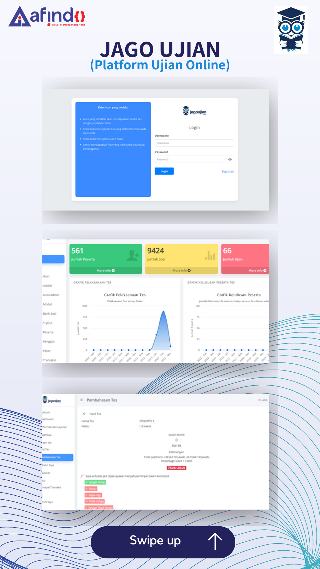 Jago Ujian adalah platform ujian online berbasis Web App yang dirancang untuk mempermudah pelaksanaan tes secara digital. Sistem ini mendukung berbagai jenis ujian seperti try out, ulangan, maupun ujian resmi dengan fitur lengkap mulai dari bank soal, pelaksanaan ujian, hingga laporan hasil nilai. Dengan akses langsung melalui browser tanpa perlu instalasi, Jago Ujian praktis digunakan oleh sekolah, perguruan tinggi, maupun lembaga bimbingan belajar.