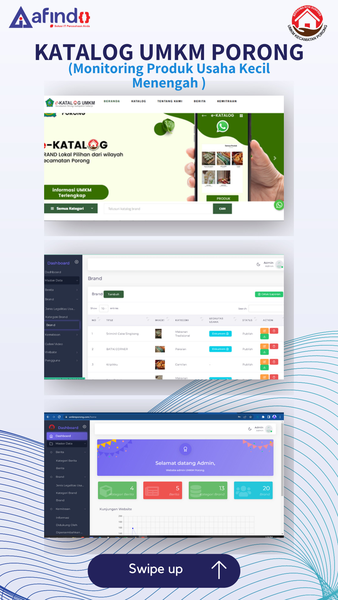 KATALOG UMKM adalah aplikasi web yang dirancang untuk mendukung proses monitoring, promosi, dan pengelolaan data produk dari pelaku Usaha Kecil dan Menengah (UMKM). Platform ini menjadi sarana digital untuk menampilkan informasi produk, legalitas usaha, brand, hingga peluang kemitraan sehingga memudahkan masyarakat maupun mitra bisnis dalam menemukan dan menjalin kerja sama dengan UMKM.