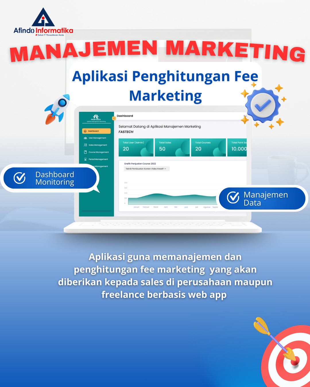 Melalui aplikasi ini, perusahaan dapat memantau jumlah sales, course yang dijual, pencapaian point sales, serta bonus yang harus diberikan kepada masing-masing sales. Proses pencatatan, validasi, hingga pelaporan dapat dilakukan dalam satu dashboard terpusat.